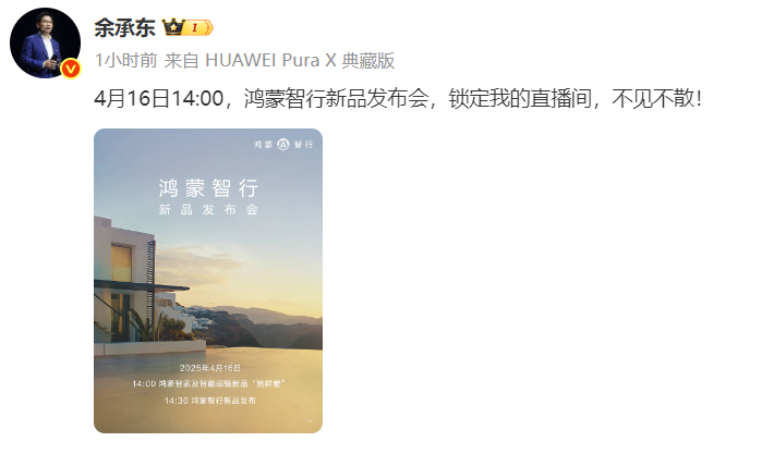 上证报中国证券网讯华为常务董事、终端BG董事长余承东4月10日在个人微博宣布:“4月16日14:00,鸿蒙智行新品发布会,锁定我的直播间”。