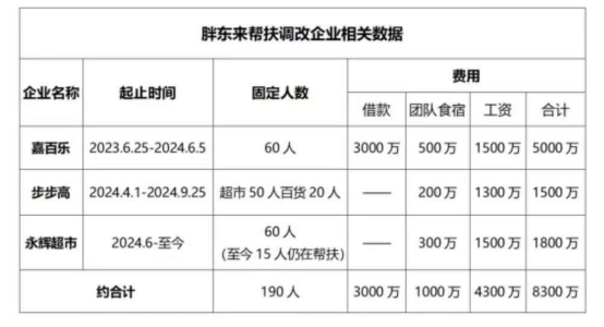 具体来看,在帮扶企业调改方面,胖东来表示从2023年6月帮扶江西上饶嘉百乐企业起,到湖南步步高、永辉超市,均是无偿帮扶,并自费投入人力物力支持,直接产生帮扶费用约8300万元。
