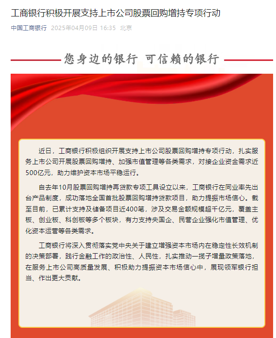 据工商银行官微4月9日消息,近日,工商银行积极组织开展支持上市公司股票回购增持专项行动,扎实服务上市公司开展股票回购增持、加强市值管理等各类需求,对接企业资金需求近500亿元,助力维护资本市场平稳运行。