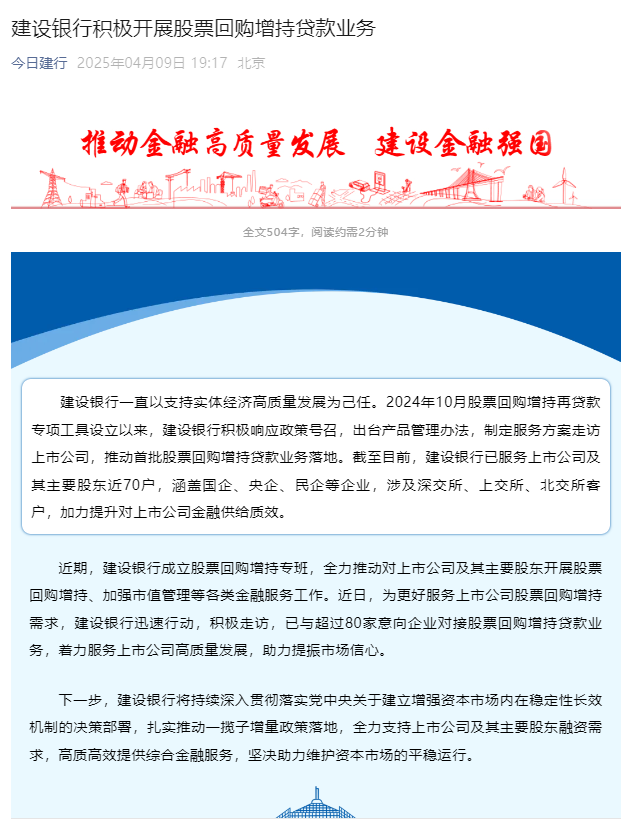 据今日建行官微4月9日消息,建设银行一直以支持实体经济高质量发展为己任。2024年10月股票回购增持再贷款专项工具设立以来,建设银行积极响应政策号召,出台产品管理办法,制定服务方案走访上市公司,推动首批股票回购增持贷款业务落地。截至目前,建设银行已服务上市公司及其主要股东近70户,涵盖国企、央企、民企等企业,涉及深交所、上交所、北交所客户,加力提升对上市公司金融供给质效。
