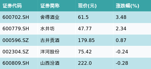 截至收盘,次高端白酒主题涨跌幅最高的五只股票为:舍得酒业(600702.SH)、水井坊(600779.SH)、古井贡酒(000596.SZ)、洋河股份(002304.SZ)与山西汾酒(600809.SH)。详情见下表: