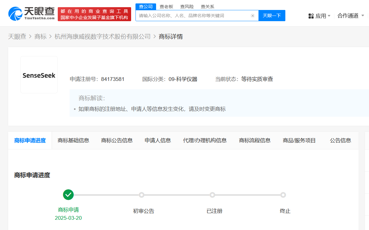 天眼查知识产权信息显示,近日,海康威视(002415)申请注册一枚“SenseSeek”商标,国际分类为科学仪器,当前商标状态为等待实质审查。杭州海康威视数字技术股份有限公司成立于 2001年11月,法定代表人为胡扬忠,注册资本约92.33亿人民币,由中电海康集团有限公司、龚虹嘉等共同持股。