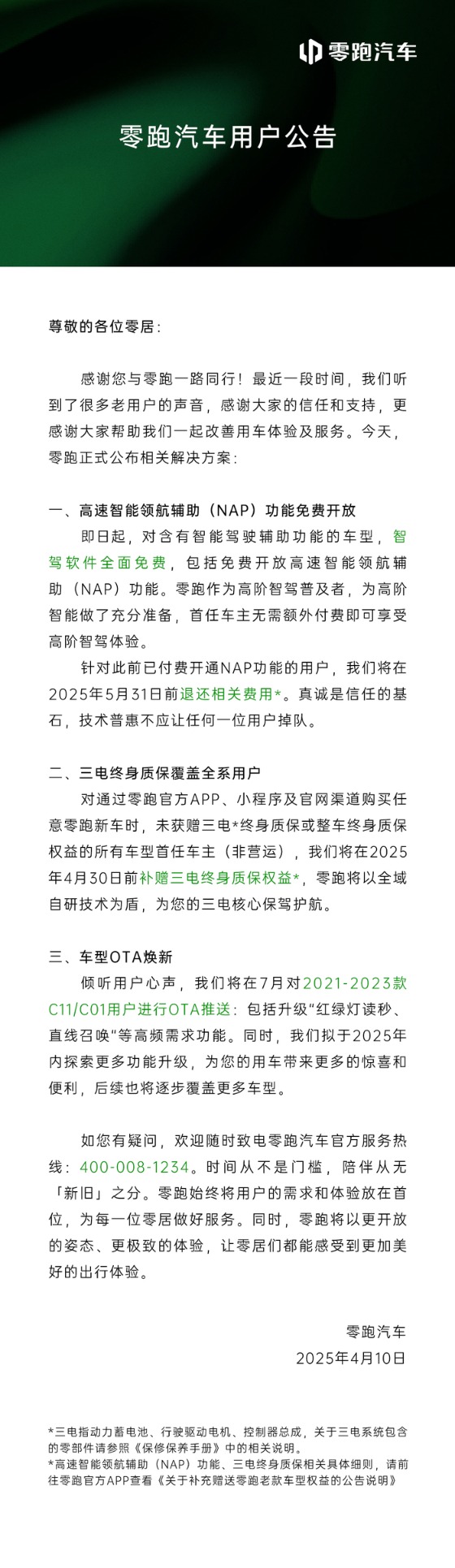 4月10日,零跑汽车发布公告称,即日起,对含有智能驾驶辅助功能的车型,智驾软件全面免费,包括免费开放高速智能领航辅助(NAP)功能。针对此前已付费开通NAP功能的用户,公司将在2025年5月31日前退还相关费用。