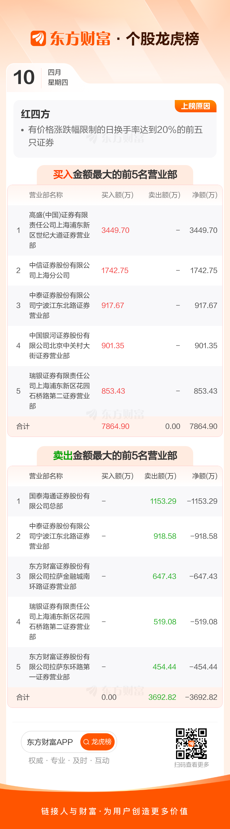 交易所2025年4月10日公布的交易公开信息显示,红四方因成为有价格涨跌幅限制的日换手率达到20%的前五只证券上榜。红四方当日收报47.47元,涨跌幅0.91%,偏离值25.58%,换手率25.58%,成交额4.93亿。