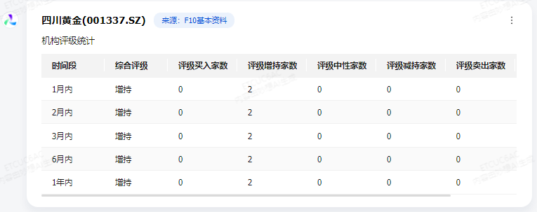 四川黄金在近1月内、近2月内、近3月内、近6月内以及近1年内,均获得了机构的“增持”评级,评级机构总家数为2家,且无买入、中性、减持或卖出评级。