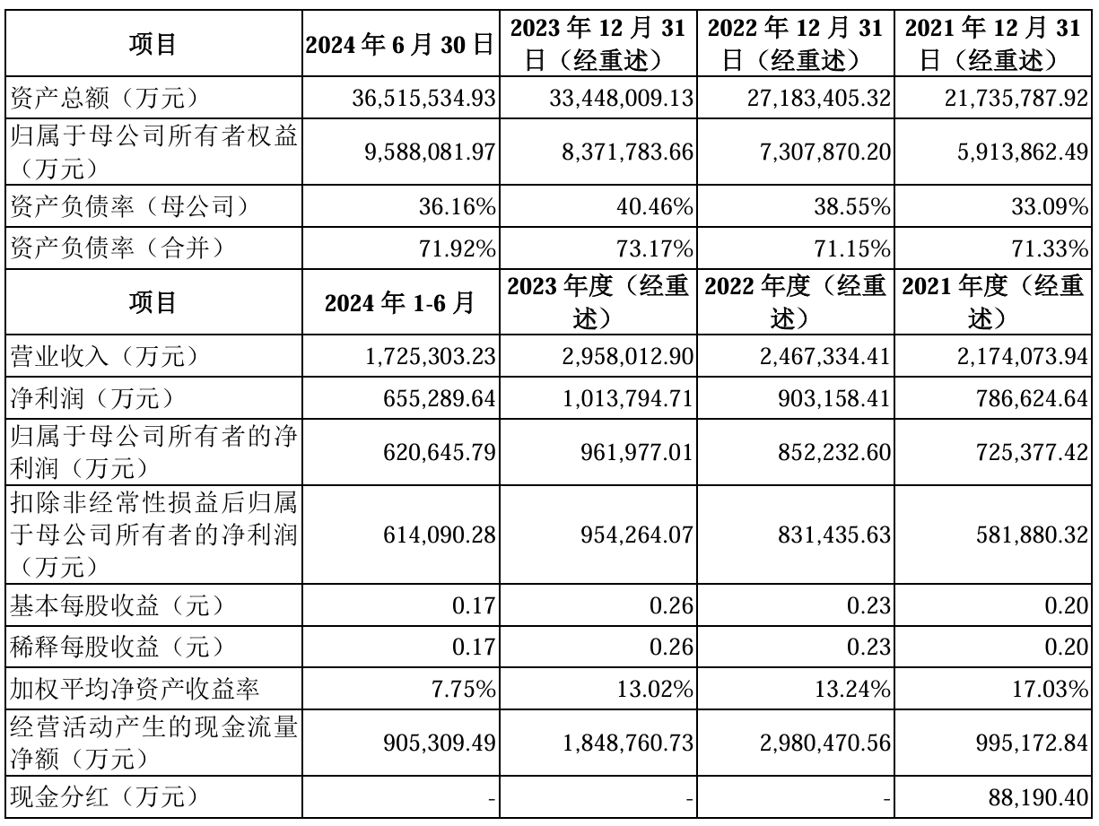 招股书注册稿显示,公司2024年全年营收339.68亿元,同比增长14.83%,但净利润88.31亿元,同比下降8.2%,主要因综合毛利率下降和期间费用率提升。