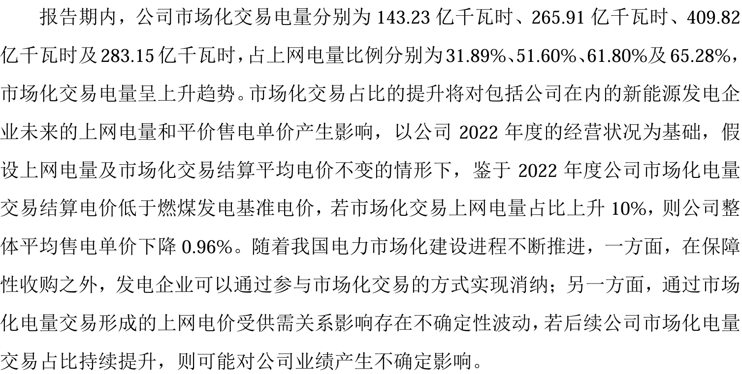 此外,华电新能的市场化交易电量占比从2021年的31.89%激增至2024年上半年的65.28%,若再上升10%,售电单价将下降0.96%,而2024年平均电价已较2023年下滑约5%。
