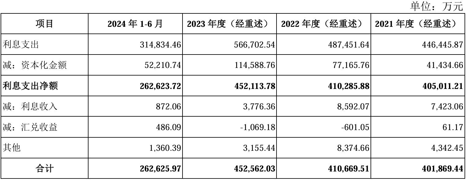 公司的现金流与偿债压力进一步凸显。2024年上半年,公司经营性现金流净额为90.53亿元,而短期借款及一年内到期的非流动负债分别约366亿元和201亿元。2021-2023年,利息费用分别为40.5亿元、41.0亿元和45.2亿元,2024年上半年为26.3亿元。