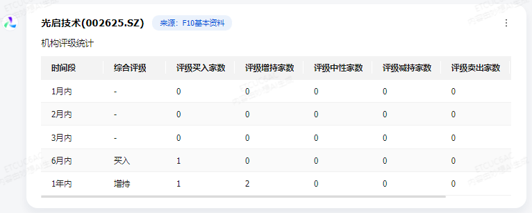 截至最近的评级数据,光启技术在近6个月内获得了1家机构的买入评级,在近1年内获得了3家机构的评级,其中1家给予买入评级,2家给予增持评级。