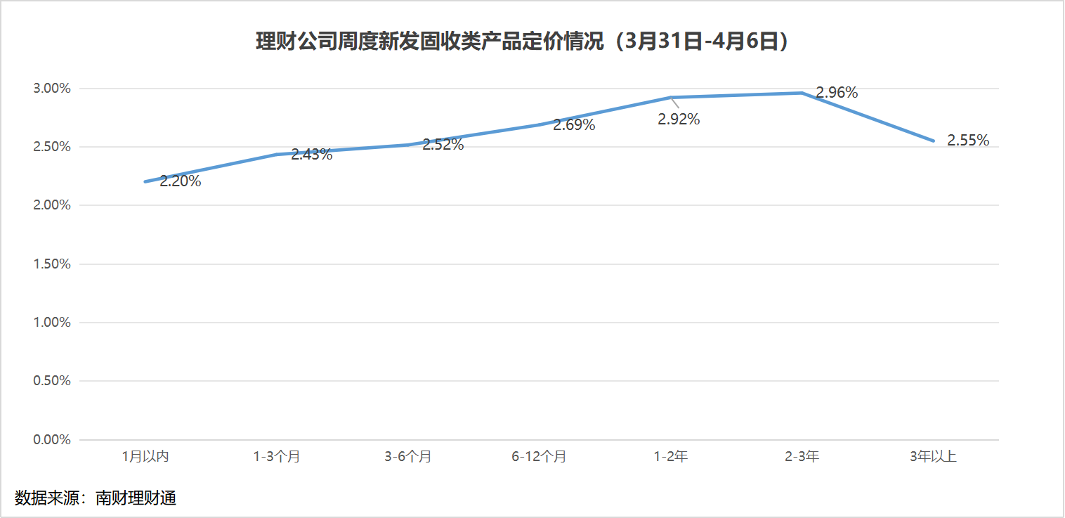 从新发产品定价看,上周新发固收类产品业绩比较基准均值为2.63%,环比下降了0.09个百分点,不同期限产品定价均在3%以下。分不同期限看,除1—3月产品定价环比上升了0.13个百分点、2—3年期限环比持平外,其余期限产品定价均有所下滑。不过,周度产品发行量较少,相关统计数据仅供参考。
