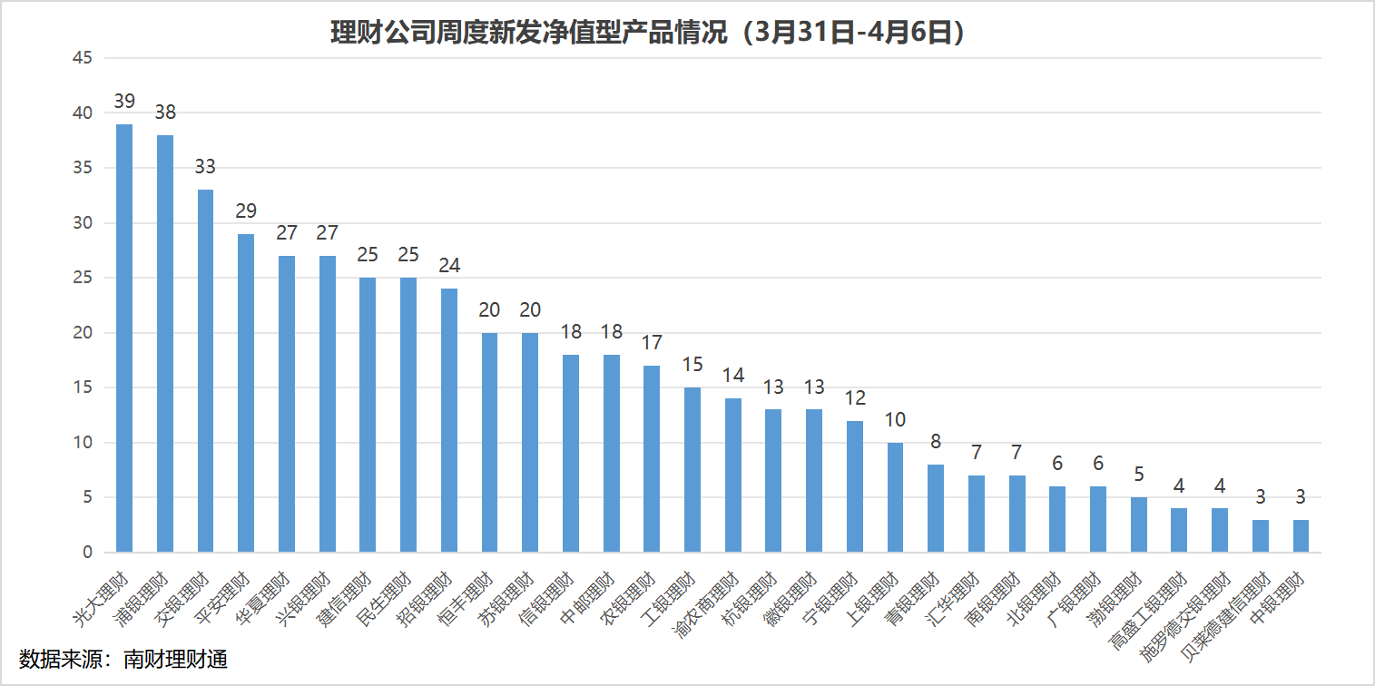 南财理财通数据显示,上周(3月31日—4月6日),30家理财公司合计发行了490只理财产品(同一产品登记编码下不同份额合并计算),股份行理财公司发行产品数量位居前三,分别是光大理财、浦银理财和交银理财。