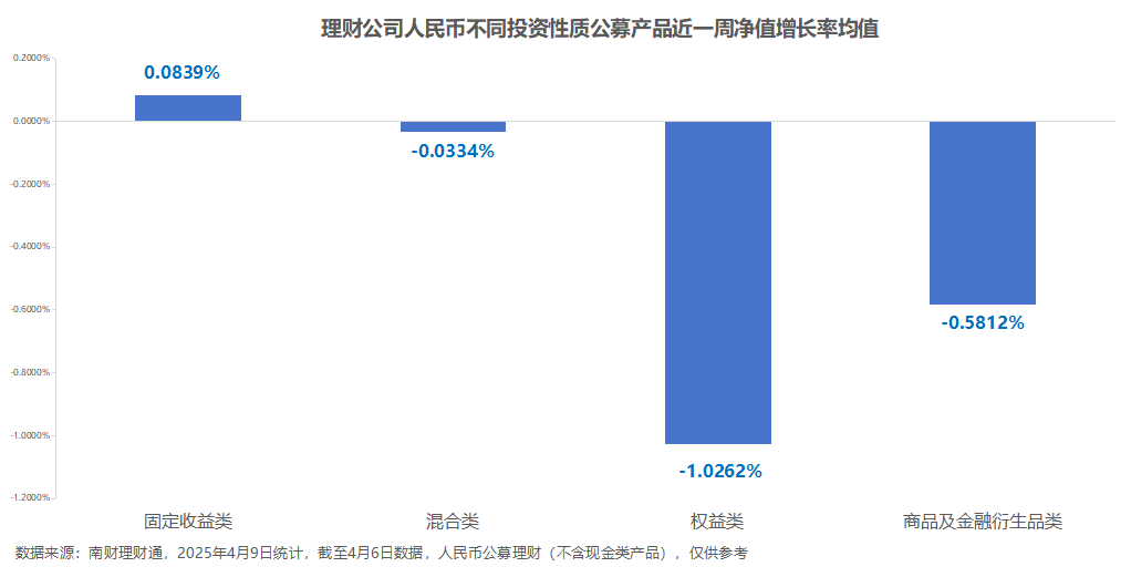 从负收益情况看,5.34%的人民币公募理财产品(理财公司发行)近一周收益为负。具体来看,近一周收益为负的固定收益类、混合类、权益类、商品及金融衍生品类理财产品比例分别为3.26%、35.71%、77.78%和100%。