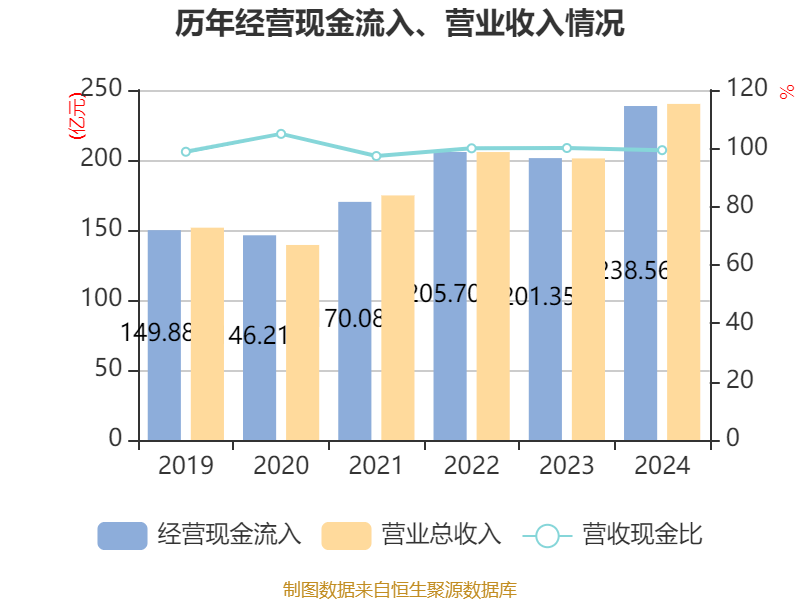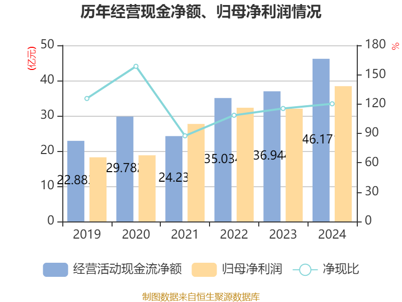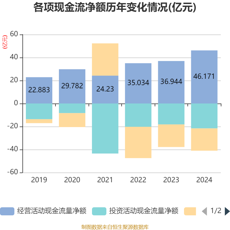 截至2024年,公司经营活动现金流净额为46.17亿元,同比增长24.97%;筹资活动现金流净额-19.37亿元,同比增加2562.42万元;投资活动现金流净额-21.65亿元,上年同期为-18.21亿元。