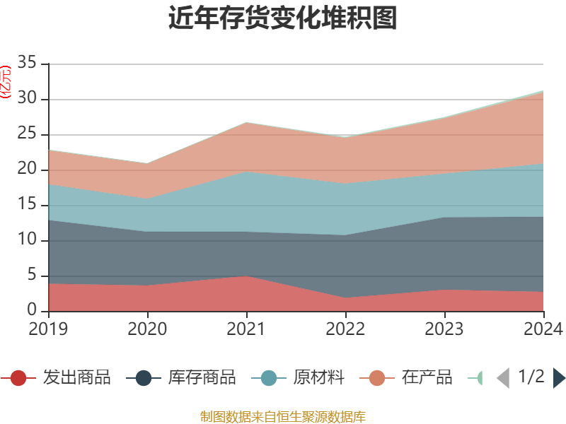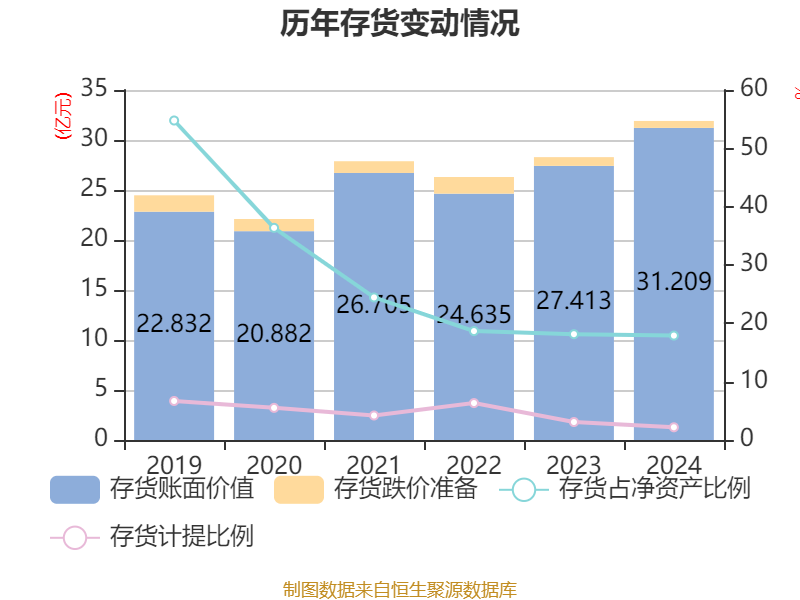 从存货变动来看,截至2024年末,公司存货账面价值为31.21亿元,占净资产的17.9%,较上年末增加3.8亿元。其中,存货跌价准备为6941.97万元,计提比例为2.18%。