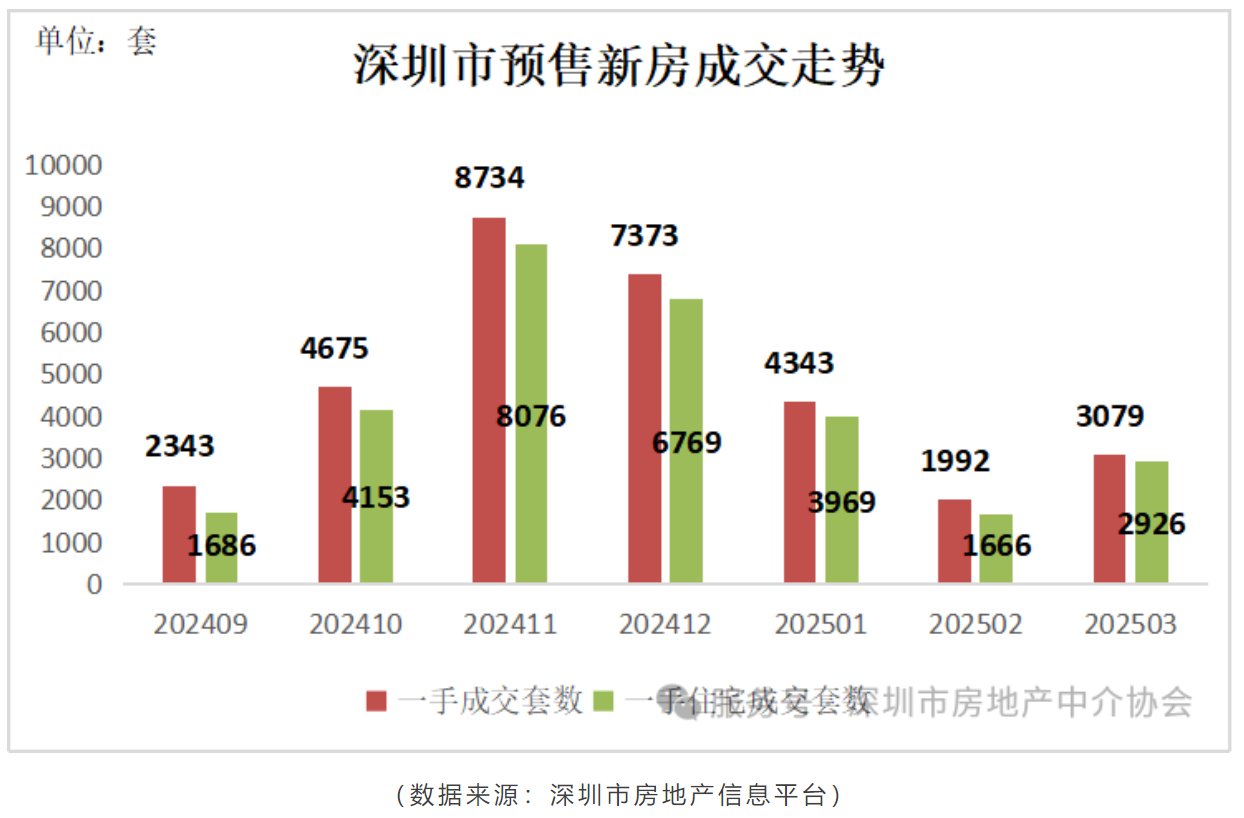 从近一年深圳新建住宅的成交数据看,在去年9月创下1686套的成交新低后,月度成交量不断回暖。去年11月—今年1月,深圳新建住宅成交分别为4153套、8076套、6769套和3969套。今年2月,受春节假期影响,深圳新建住宅成交量降至1666套,3月成交量大幅回升。