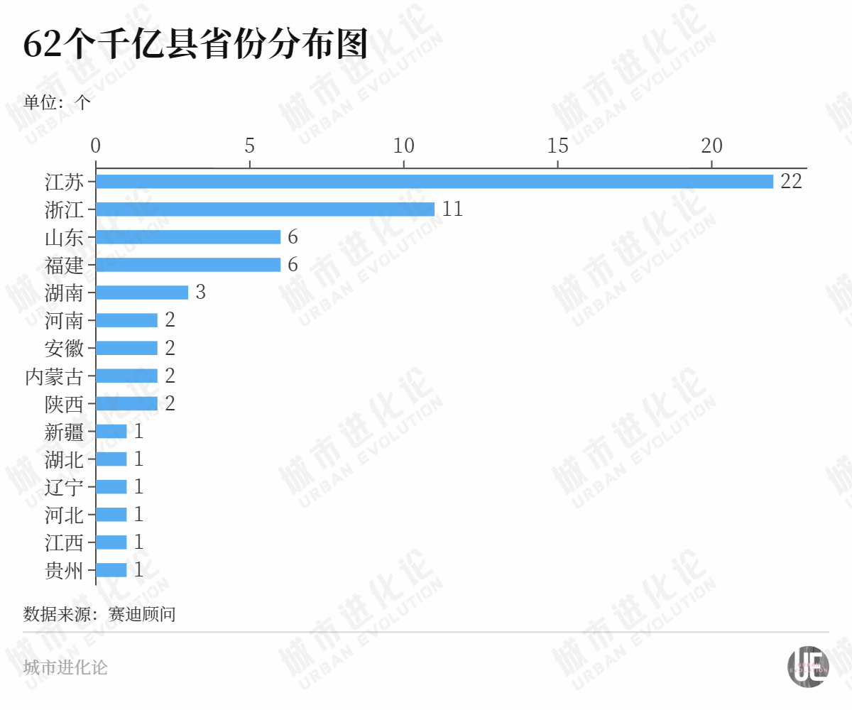 过去三年时间里,千亿县分别增长10个、5个、3个,千亿县阵容持续扩容。截至目前,62个千亿县主要分布在江苏、浙江、福建、山东等15个省份,其中江苏、浙江、福建、山东分别达22个、11个、6个、6个,堪称千亿县“收割机”。