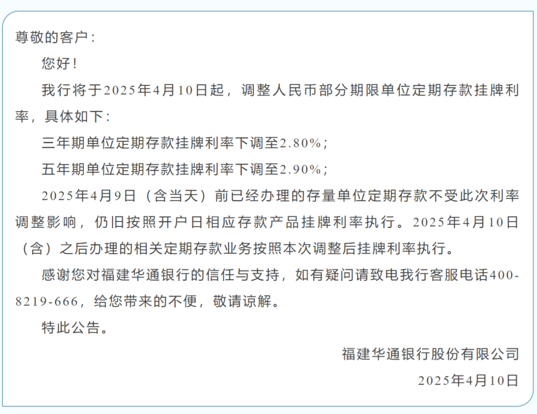 4月10日,福建华通银行发布公告称,该行于4月10日起,将三年期单位定期存款挂牌利率下调至2.80%,五年期单位定期存款挂牌利率下调至2.90%。