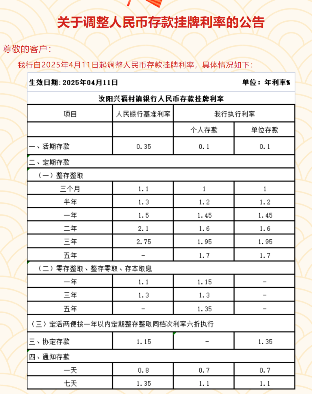 4月10日,汝阳兴福村镇银行发布公告表示,将于4月11起调整人民币存款挂牌利率,其中6个月期定期存款利率由1.3%下调至1.2%,1年期定期存款利率由1.65%下调至1.45%,2年期定期存款利率由1.7%下调至1.6%。