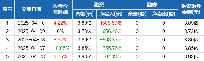融资方面,当日融资买入1.1亿元,融资偿还9366.02万元,融资净买入1588.59万元。融券方面,融券卖出0股,融券偿还0股,融券余量0股,融券余额0元。融资融券余额合计3.89亿元。