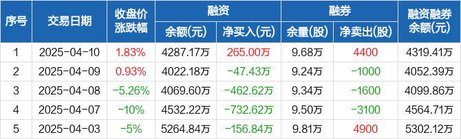 大有能源融资融券信息显示,2025年4月10日融资净买入265万元;融资余额4287.17万元,较前一日增加6.59%。