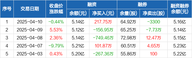 中远海发融资融券信息显示,2025年4月10日融资净买入217.75万元;融资余额5.14亿元,较前一日增加0.43%。