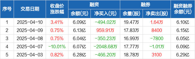 融资方面,当日融资买入1029.26万元,融资偿还1523.28万元,融资净偿还494.02万元。融券方面,融券卖出1.64万股,融券偿还0股,融券余量19.47万股,融券余额135.9万元。融资融券余额合计6.1亿元。