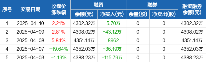 融资方面,当日融资买入159.8万元,融资偿还165.5万元,融资净偿还5.7万元,连续6日净偿还累计222.18万元。融券方面,融券卖出0股,融券偿还0股,融券余量0股,融券余额0元。融资融券余额合计4302.32万元。