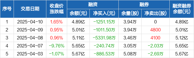 融资方面,当日融资买入1205.33万元,融资偿还2456.47万元,融资净偿还1251.15万元,连续5日净偿还累计8721.89万元。融券方面,融券卖出0股,融券偿还0股,融券余量3.94万股,融券余额16.98万元。融资融券余额合计4.89亿元。