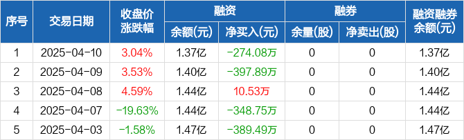 融资方面,当日融资买入851.43万元,融资偿还1125.51万元,融资净偿还274.08万元。融券方面,融券卖出0股,融券偿还0股,融券余量0股,融券余额0元。融资融券余额合计1.37亿元。
