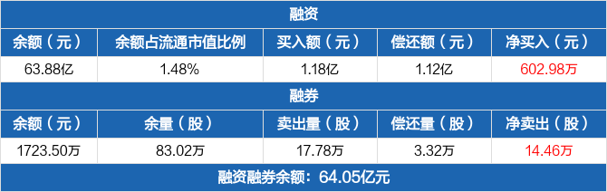融资方面,当日融资买入1.18亿元,融资偿还1.12亿元,融资净买入602.98万元,连续5日净买入累计2.47亿元。融券方面,融券卖出17.78万股,融券偿还3.32万股,融券余量83.02万股,融券余额1723.5万元。融资融券余额合计64.05亿元。