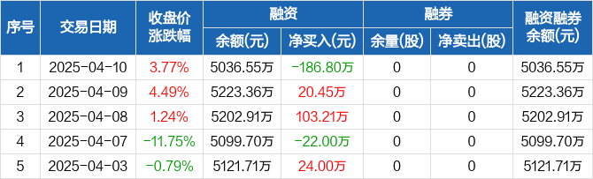 融资方面,当日融资买入229.63万元,融资偿还416.43万元,融资净偿还186.8万元。融券方面,融券卖出0股,融券偿还0股,融券余量0股,融券余额0元。融资融券余额合计5036.55万元。