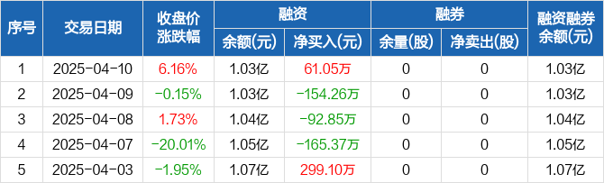 融资方面,当日融资买入410.36万元,融资偿还349.31万元,融资净买入61.05万元。融券方面,融券卖出0股,融券偿还0股,融券余量0股,融券余额0元。融资融券余额合计1.03亿元。