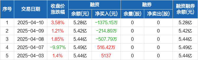 融资方面,当日融资买入839.05万元,融资偿还2214.2万元,融资净偿还1375.15万元,净偿还额创12个月新高,连续3日净偿还累计2097.82万元。融券方面,融券卖出0股,融券偿还0股,融券余量0股,融券余额0元。融资融券余额合计5.28亿元。