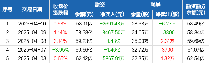 融资方面,当日融资买入1.76亿元,融资偿还2.03亿元,融资净偿还2691.48万元,连续5日净偿还累计4.59亿元。融券方面,融券卖出1.15万股,融券偿还7.42万股,融券余量28.38万股,融券余额3778.8万元。融资融券余额合计58.49亿元。
