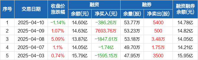 融资方面,当日融资买入3.88亿元,融资偿还3.92亿元,融资净偿还386.26万元。融券方面,融券卖出1.09万股,融券偿还5500股,融券余量53.77万股,融券余额1862.06万元。融资融券余额合计14.78亿元。
