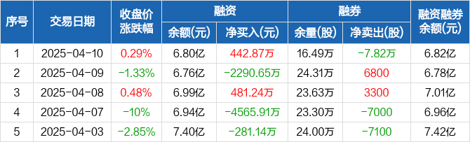融资方面,当日融资买入3297.24万元,融资偿还2854.37万元,融资净买入442.87万元。融券方面,融券卖出1700股,融券偿还7.99万股,融券余量16.49万股,融券余额171.17万元。融资融券余额合计6.82亿元。