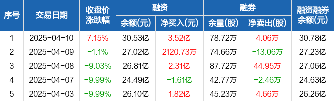 融资方面,当日融资买入9.43亿元,融资偿还5.91亿元,融资净买入3.52亿元,净买入额创12个月新高,净买入额两市排名第三,连续3日净买入累计6.04亿元。融券方面,融券卖出18.5万股,融券偿还14.44万股,融券余量78.72万股,融券余额2419.18万元。融资融券余额合计30.78亿元。