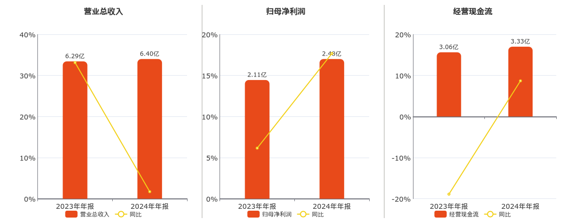 公司营业总收入为6.40亿元,较去年同报告期营业总收入增加1084.37万元,实现2年连续上涨,同比较去年同期上涨1.72%。归母净利润为2.48亿元,较去年同报告期归母净利润增加3726.83万元,实现3年连续上涨,同比较去年同期上涨17.67%。经营活动现金净流入为3.33亿元,较去年同报告期经营活动现金净流入增加2660.15万元,同比较去年同期上涨8.69%。