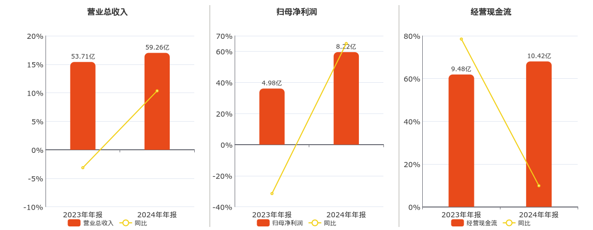 公司营业总收入为59.26亿元。归母净利润为8.22亿元。经营活动现金净流入为10.42亿元。