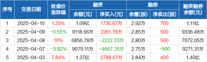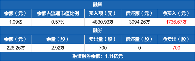 融资方面,当日融资买入4830.93万元,融资偿还3094.26万元,融资净买入1736.67万元。融券方面,融券卖出700股,融券偿还0股,融券余量2.92万股,融券余额226.26万元。融资融券余额合计1.11亿元。