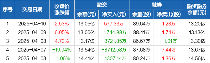 机器人融资融券信息显示,2025年4月10日融资净买入577.33万元;融资余额13.05亿元,较前一日增加0.44%