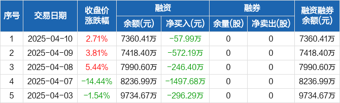 零点有数融资融券信息显示,2025年4月10日融资净偿还57.99万元;融资余额7360.41万元,较前一日下降0.78%