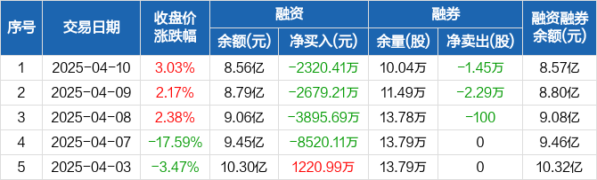 道氏技术融资融券信息显示,2025年4月10日融资净偿还2320.41万元;融资余额8.56亿元,较前一日下降2.64%