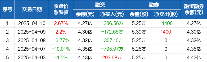融资方面,当日融资买入2063.46万元,融资偿还2370.02万元,融资净偿还306.56万元,连续4日净偿还累计1582.28万元。融券方面,融券卖出100股,融券偿还1500股,融券余量5.25万股,融券余额42.47万元。融资融券余额合计4.27亿元。