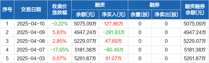 融资方面,当日融资买入361.11万元,融资偿还233.25万元,融资净买入127.86万元。融券方面,融券卖出0股,融券偿还0股,融券余量0股,融券余额0元。融资融券余额合计5075.09万元。