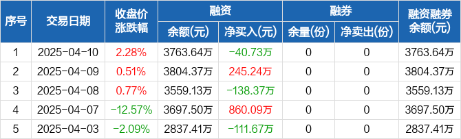 融资方面,当日融资买入826.55万元,融资偿还867.28万元,融资净偿还40.73万元。融券方面,融券卖出0份,融券偿还0份,融券余量0份,融券余额0元。融资融券余额合计3763.64万元。