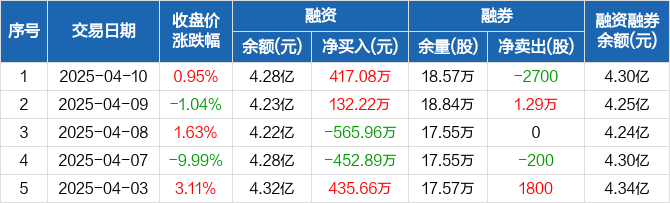 融资方面,当日融资买入2075.32万元,融资偿还1658.24万元,融资净买入417.08万元。融券方面,融券卖出500股,融券偿还3200股,融券余量18.57万股,融券余额197.03万元。融资融券余额合计4.3亿元。