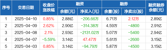 融资方面,当日融资买入3548.88万元,融资偿还3755.55万元,融资净偿还206.66万元,连续3日净偿还累计2652.06万元。融券方面,融券卖出2.16万股,融券偿还400股,融券余量6.71万股,融券余额111.45万元。融资融券余额合计2.89亿元。