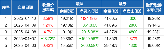 融资方面,当日融资买入6011.07万元,融资偿还4886.89万元,融资净买入1124.18万元。融券方面,融券卖出3300股,融券偿还3600股,融券余量41.06万股,融券余额450.84万元。融资融券余额合计19.26亿元。