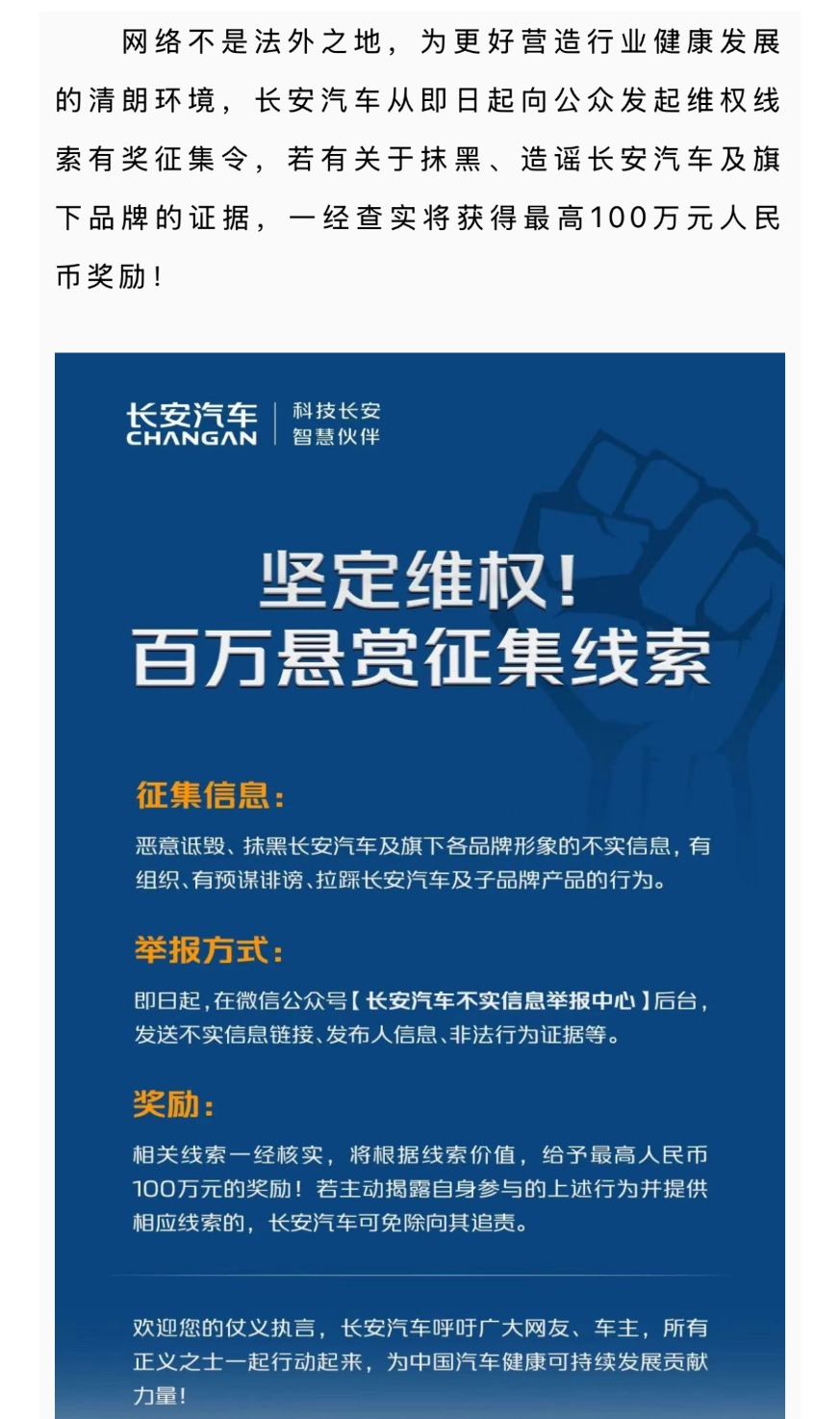 长安汽车(000625)4月9日晚在微信公众号宣布,“长安汽车从即日起向公众发起维权线索有奖征集令,若有关于抹黑、造谣长安汽车及旗下品牌的证据,一经查实将获得最高100万元人民币奖励!”